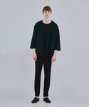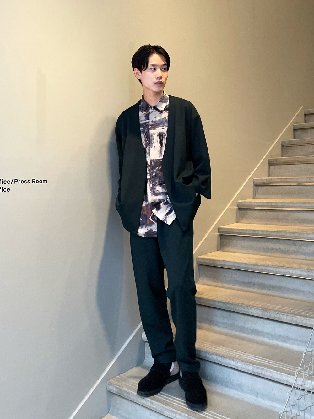 WEB限定のノーカラーセットアップを使ったスタイルです! 大人っぽい雰囲気のセットアップに柄シャツを入れてトレンド感をプラスしました! カーディガンみたいに気軽に羽織れ、凝ったスタイリングをしているように見えオススメです! 是非参考にしてみて下さい!