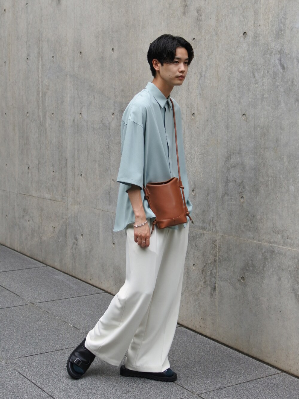 WEB限定のシャツスタイル。 淡いお洒落な色味で統一しつつバッグのキャメルの色味で上品差をプラス。 ゆったりとしたシルエットで気楽にお使い頂けるスタイルとなっています!