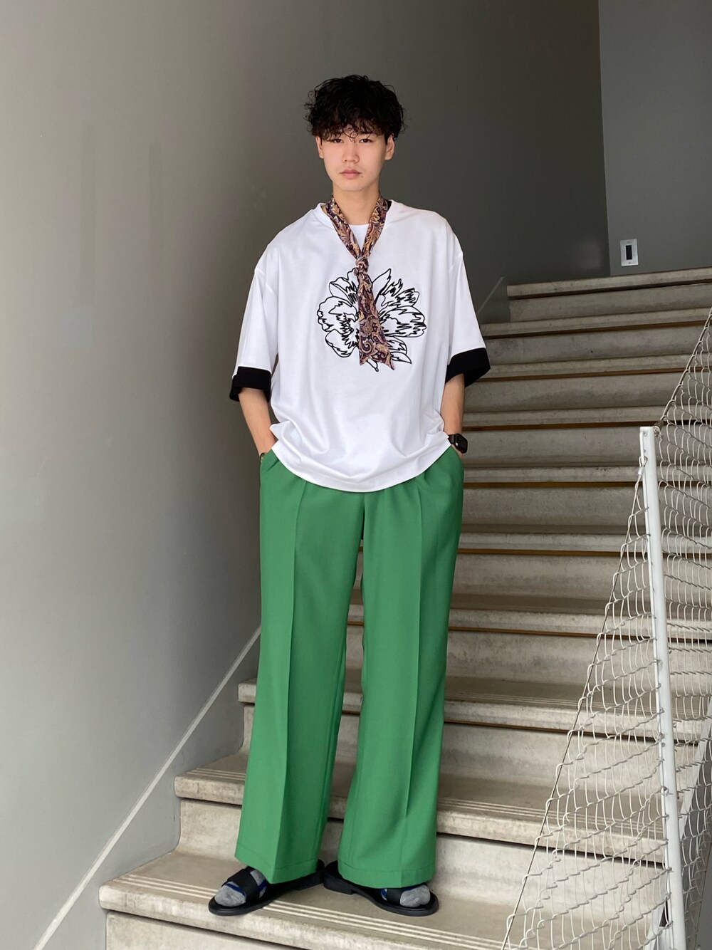 刺繍柄がスタイリングにアクセントを。 フロントの刺繍デザインが可愛らしさと、上品な印象のデザインカットソー。 全体のシルエットをゆったりとさせて、差し色としてグリーンのパンツを合わせるとトレンド感あるスタイリングが完成します! 是非参考にしてみて下さい!