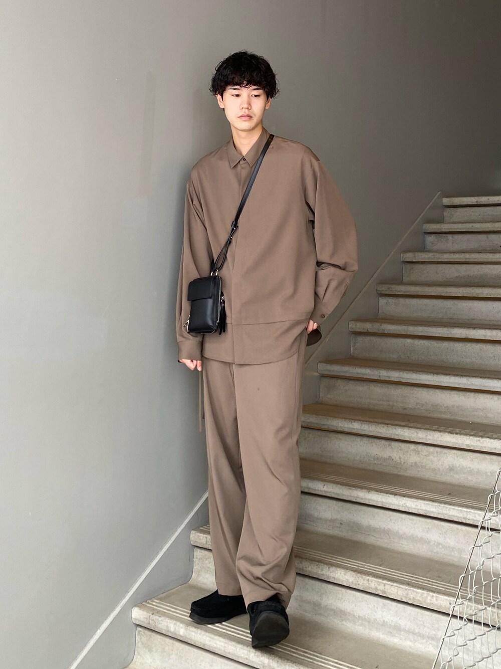 秋の新作トロミセットアップを使ったスタイリングです。 今回はベージュを使い秋らしい雰囲気全開にしてみました。 シャツはレイヤードしているようなデザインで一枚でサマになります! パンツはストレートのシルエットで今らしくクセのないデザインなので色んなスタイリングにお使い頂けるのでこのセットがあれば秋は大丈夫です!