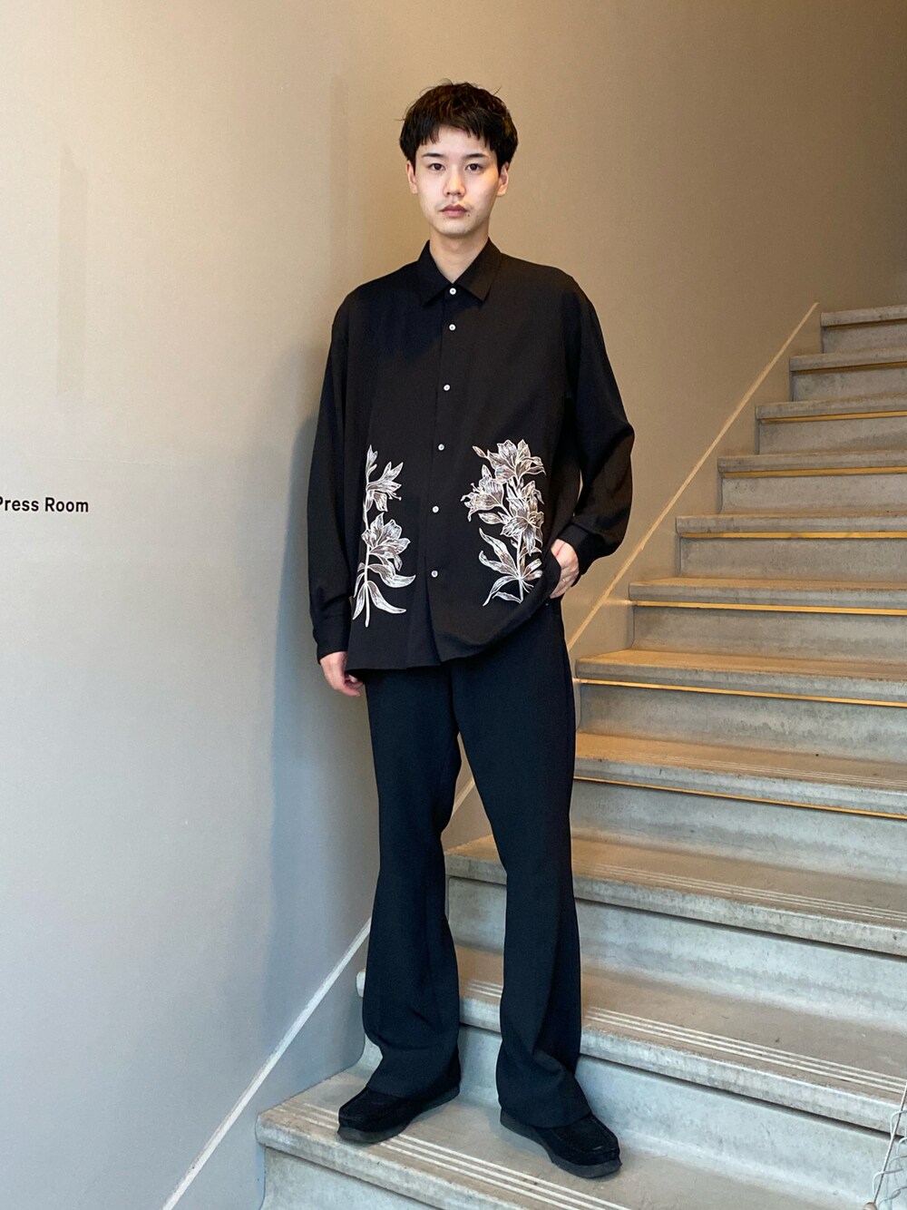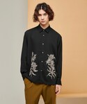 刺繍の入ったシャツを使った秋スタイル! クールにオールブラックに仕上げました! 刺繍がフラワーなので柔らかい印象になります! インナーとしても使いやすいので是非チェックしてみて下さい!