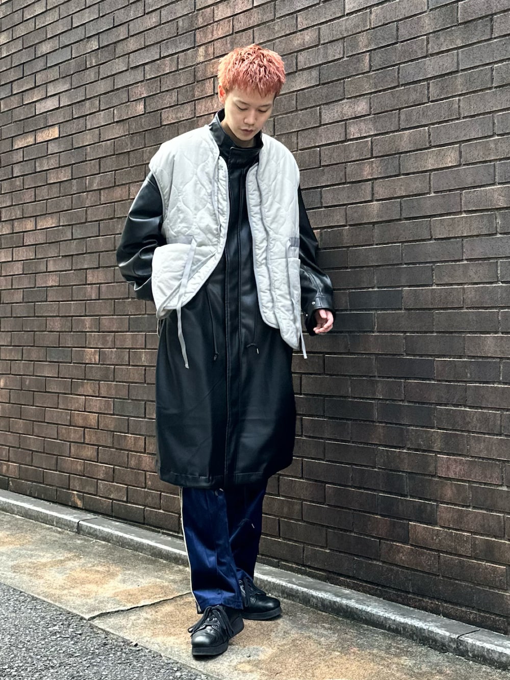 アウターオンアウターをした冬スタイル。 レザーのモッズコートでインパクトを出しつつもベストを重ねて差別化を図ったスタイリングです! クールな印象になるので是非参考にしてみて下さい!