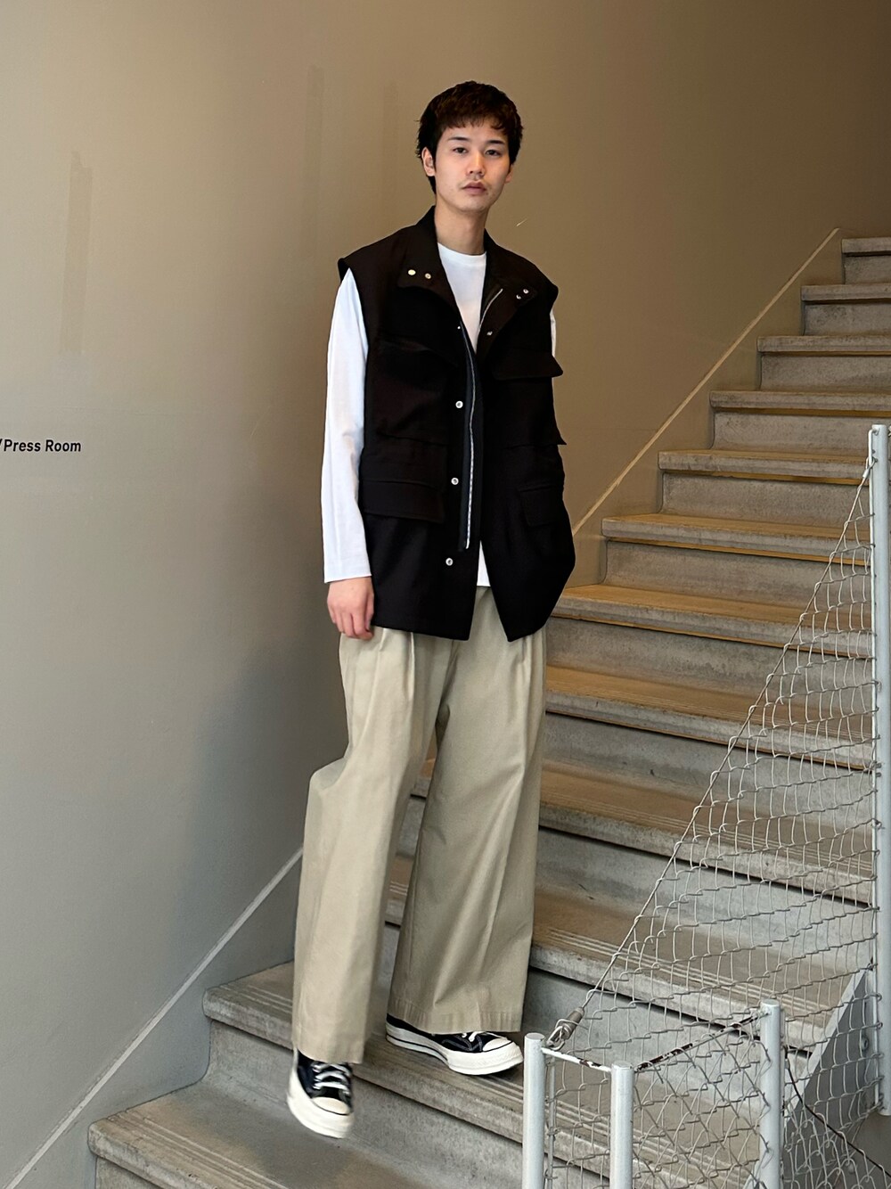 カジュアルな印象に仕上げた春スタイル。 まだカットソー一枚では寒いのでミリタリーベストを羽織って気温調整! パンツはチノバギーパンツで少しカジュアルな印象に仕上げたら完成です! 春らしい色味でおすすめです!