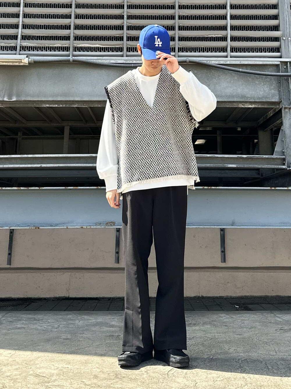 フリンジがかっこいいモード春スタイル。 一枚ではまだ肌寒いので、ベストを羽織って調整しています! フリンジディティールなので今っぽい印象で春をお楽しみ頂ける1着です! 表面の細かい凹凸感もカッコよく是非チェックしてみて下さい!