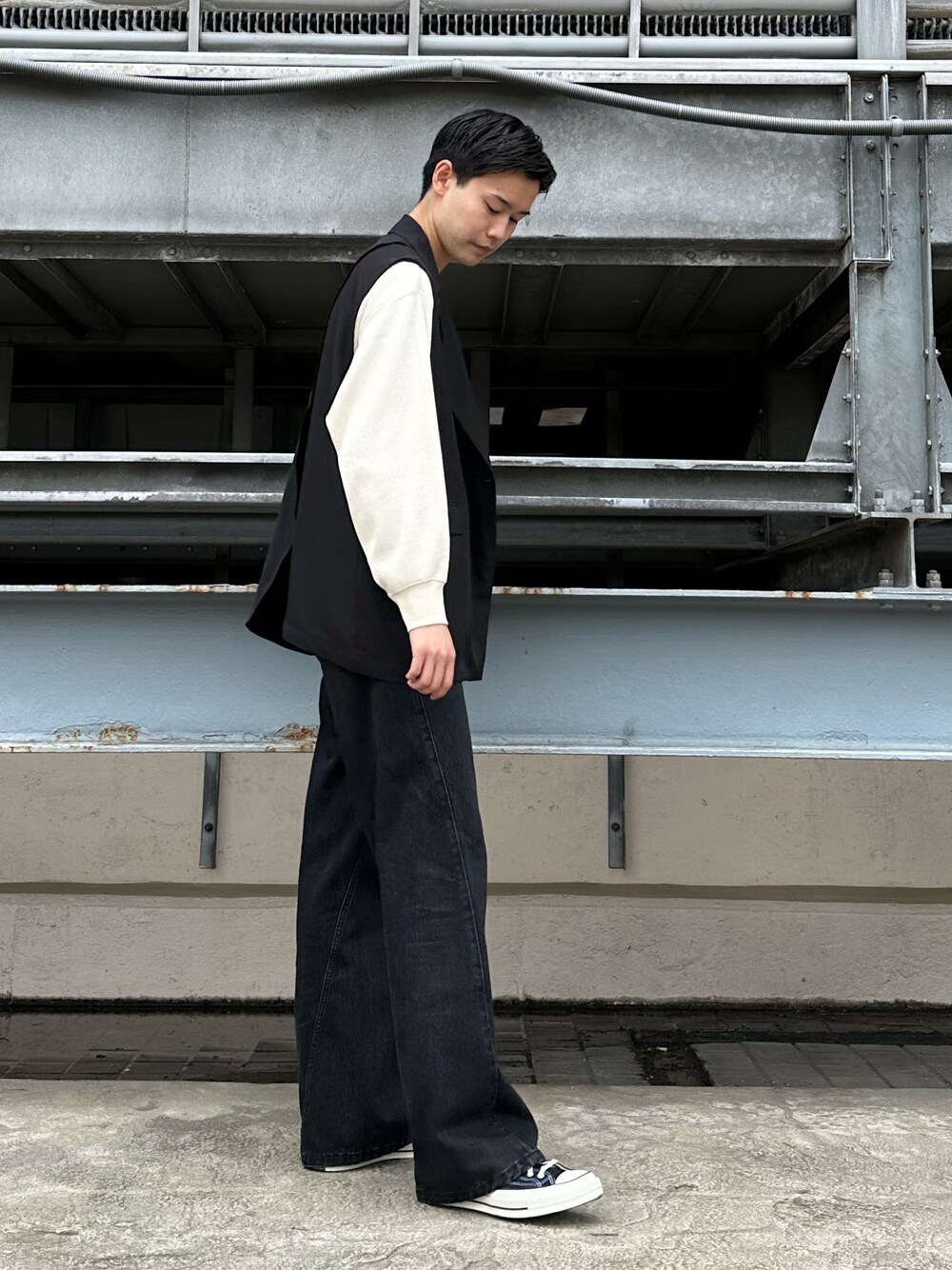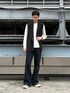 ベストを使った春スタイル。 モノトーンで整えて見え感を綺麗にしました! 春なので袖のないアイテムを合わせて季節感を演出! スッキリとした無駄のない印象でモテること間違いなしです!!