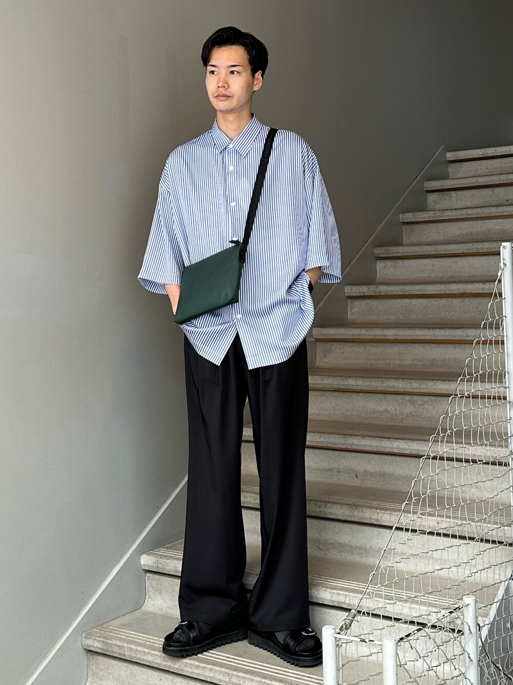 ストライプ半袖シャツ! ルーズな印象のアイテムで1着で様になります! 今っぽいシルエットですが、安定のストライプで長くお使い頂けるとおもいます! さらっとした生地なのでシワにもなりにくくヘビロテできるアイテムですよ! パンツシューズはブラック、バッグでグリーンにする事で都会的な印象にしてみました!