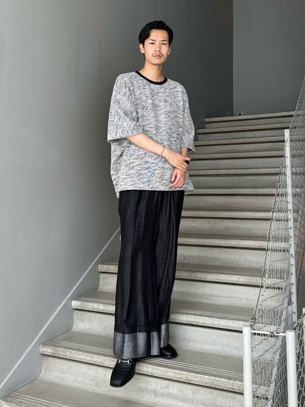 こんにちは! 新作のドルマンを合わせたデニムスタイリングです!! ツイードっぽい質感が大人っぽさを演出し、ロールアップのデニムデザインが都会的な印象に仕上げてくれます! リラックス感はありますが、都会的なイメージで合わせてみました!