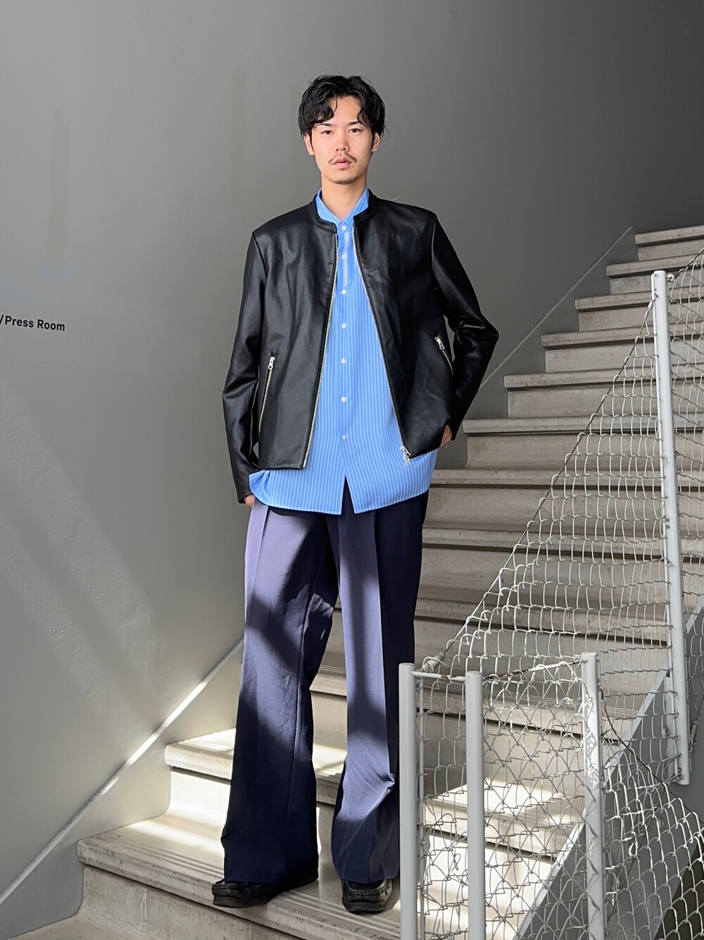 ライダースジャケットで渋さとフレアパンツでモードさを。 クールな印象もありつつもストライプシャツとワイドフレアパンツで今風な印象に。 ライダースはWEB限定のアイテムで本革調の見え感がポイントで非常にコスパの良い1着! オススメです!