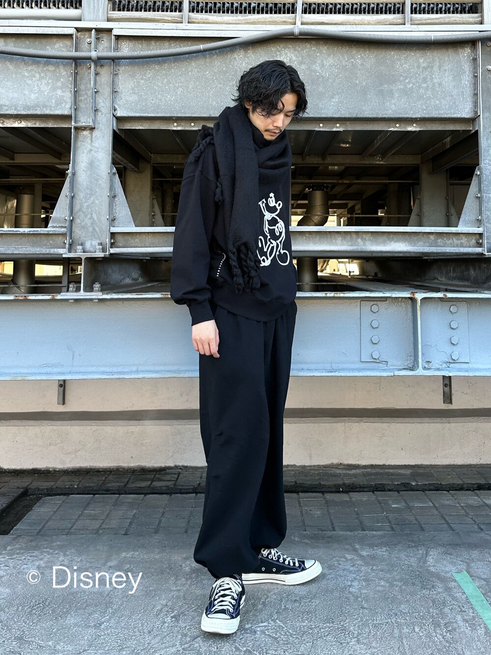 ディズニーカプセルコレクション第3弾! スウェットを使ってオールブラックコーデ組んでみました! ノームコアっぽい雰囲気を演出しながらミッキーのデザインと大判のマフラーで可愛らしさをプラスしたのがポイントです!