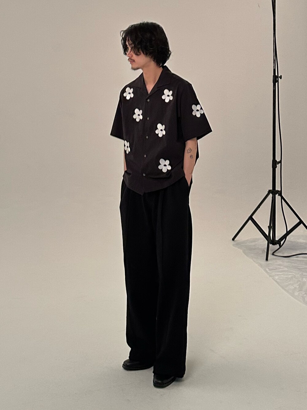 手書き風のフラワー柄がちょうどいいテンションで夏ファッションを楽しめます!! やや着丈が短いのでデニムパンツと合わせてアメカジっぽい印象にしてみました!