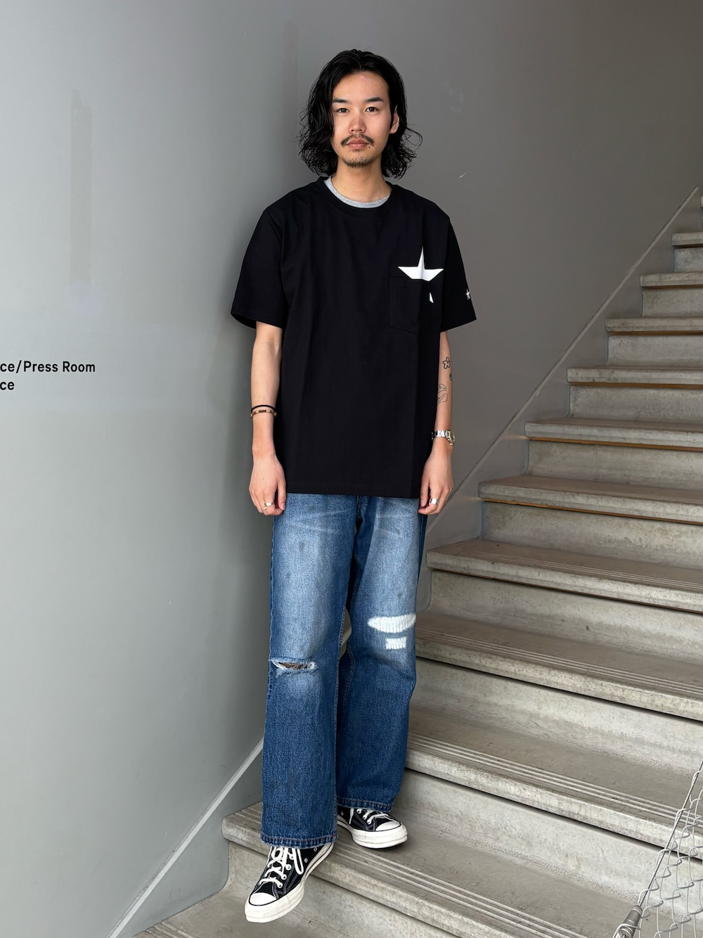 無地ボディーにワンポイントの星プリントが印象的な1着! シンプルにデニムと合わせて夏らしい印象にしてみました!
