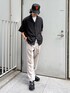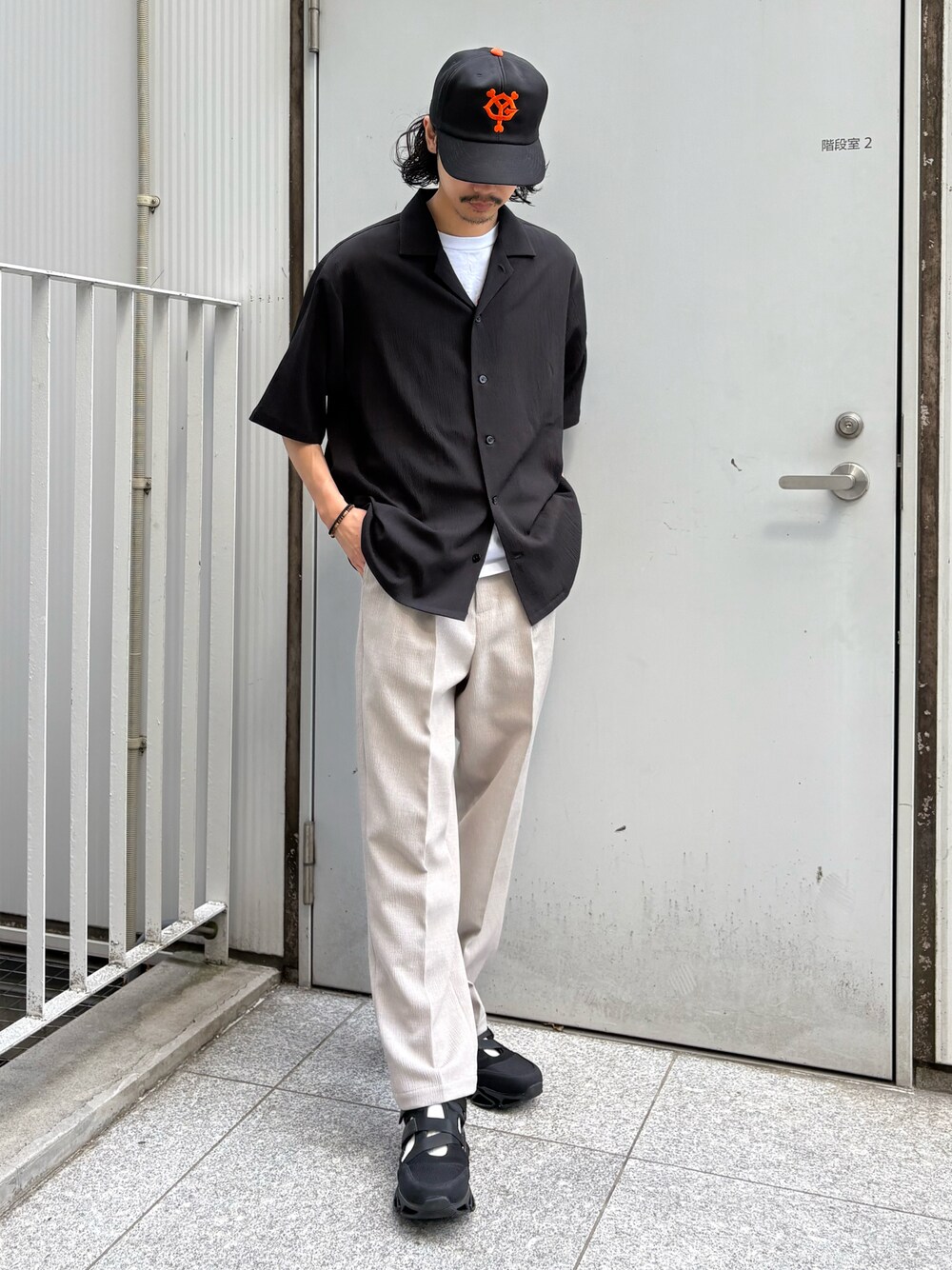上下色違いで合わせていますが、シャツとパンツが同じ素材のアイテムで統一感があります! 夏など暑い季節はシャツを着るだけでオシャレ感が出るのでおすすめです!