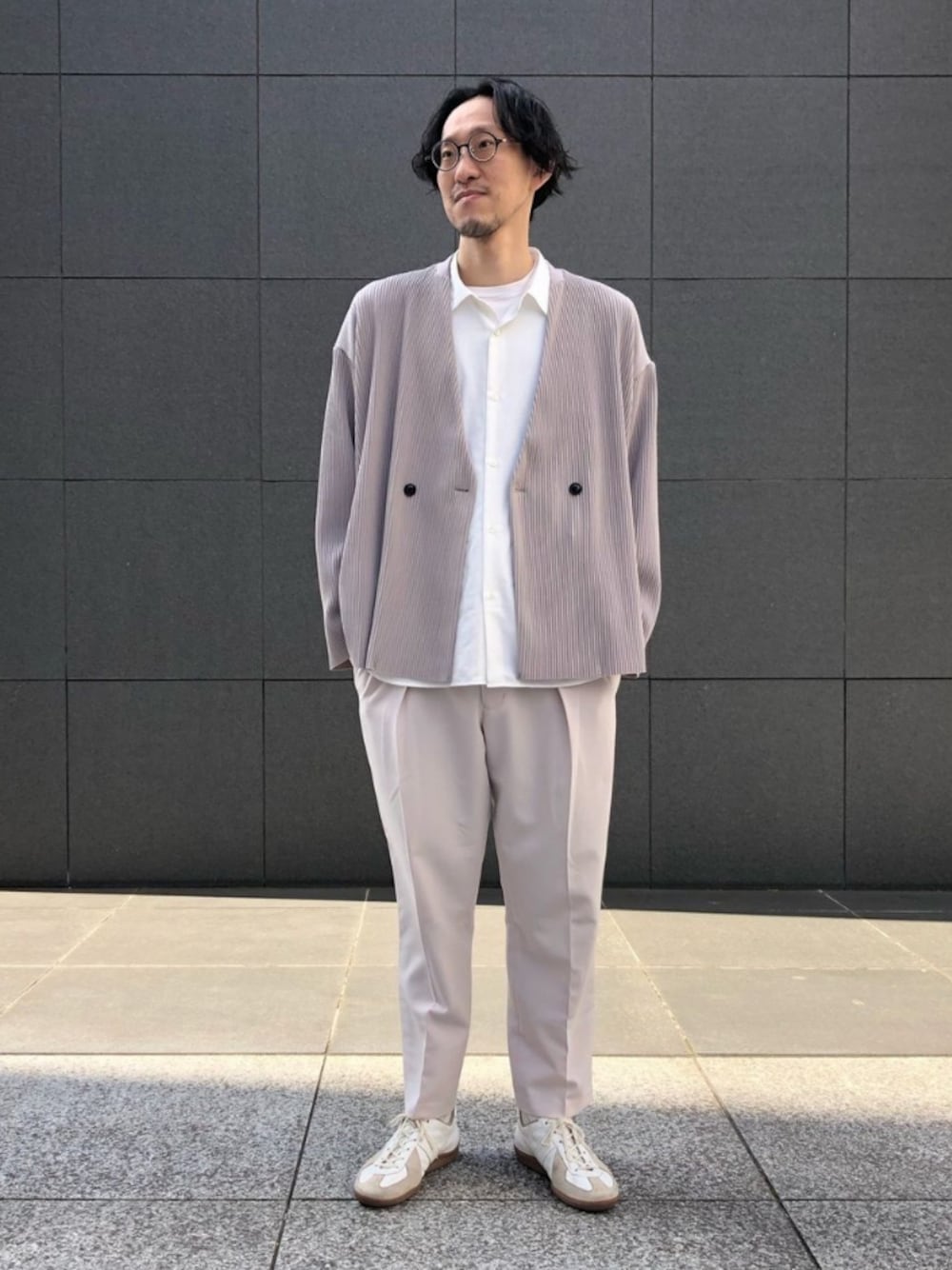 こんにちわ! 今回は今季トレンドのプリーツ素材のノーカラージャケットを使ったコーディネートのご紹介です! フリーサイズでカーディガン感覚で羽織れて、同素材のワイドパンツで合わせるのもオススメですが、今回はキレイ目なスラックスと色味を揃えて、大人の休日スタイルを意識しました! 堅くなりすぎないように、足元はスニーカーにしています! 是非一度店頭でお試しください!