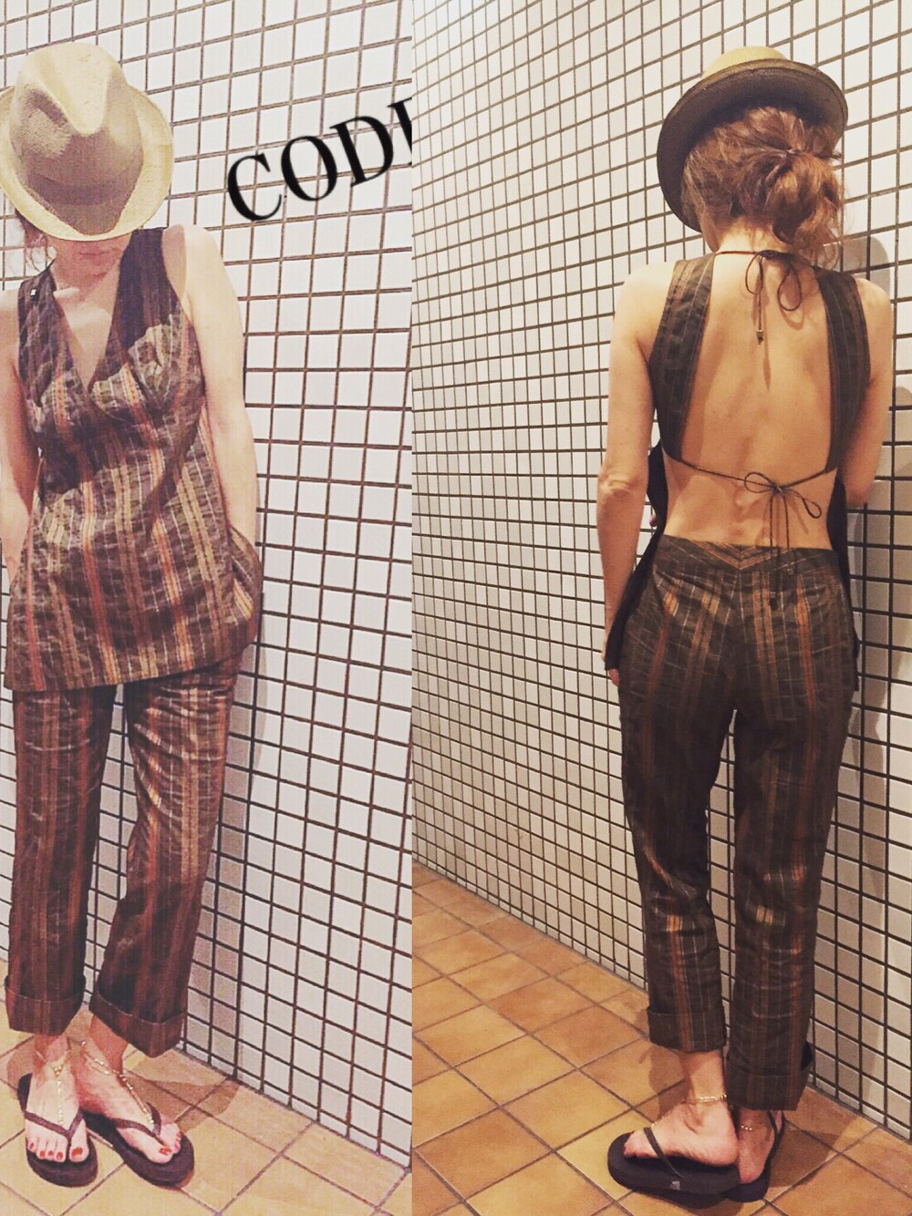 大胆に開いた背中もビーサンやアクセでカバー😆勿論、中にtube topも👍個人的には デザインが凝っている為背中は、大胆に見せても良いかなぁ〜と😍