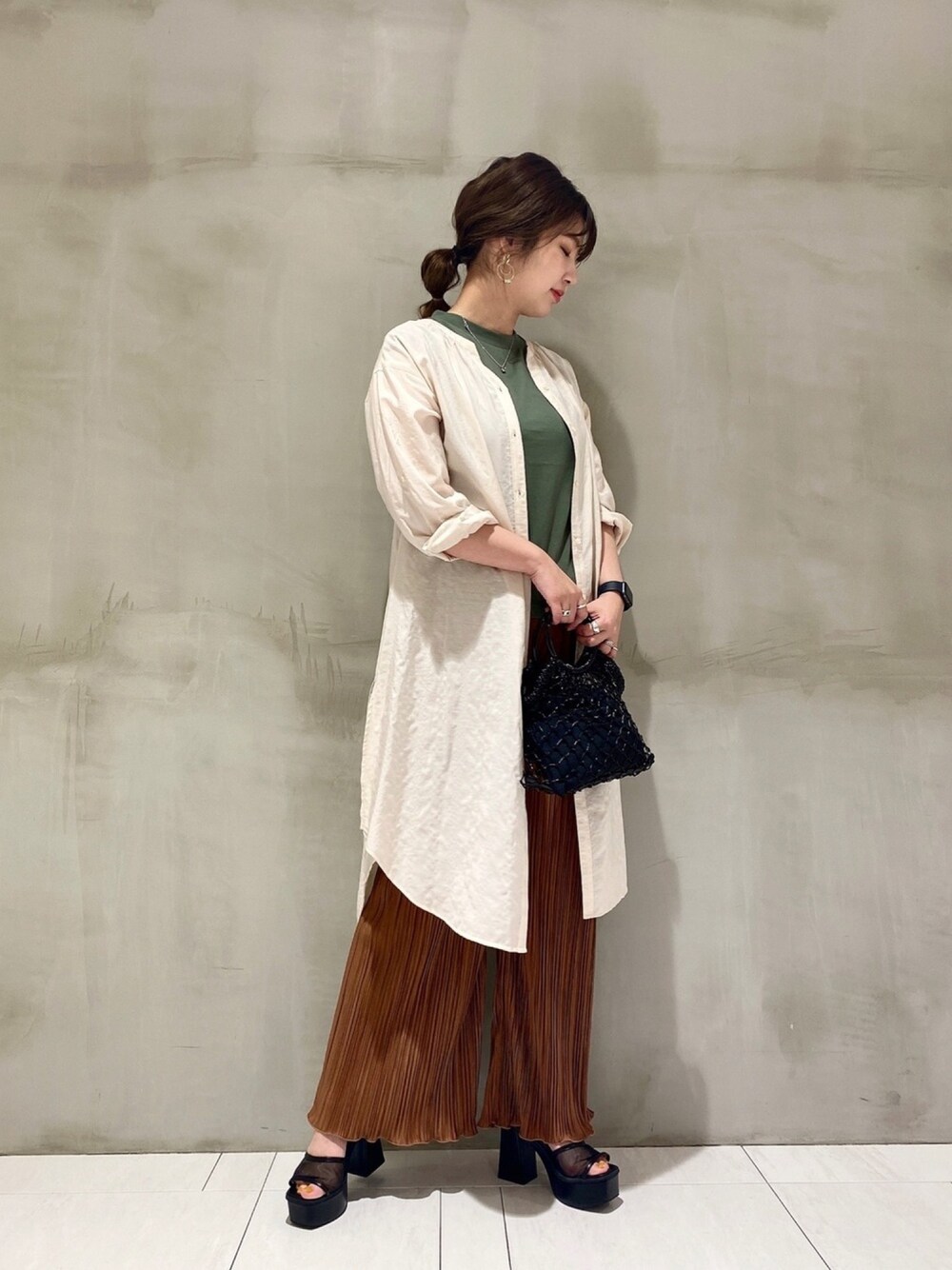 いつもご覧頂きありがとうございます! 暑くなってきてらくちんコーデをしたいこの頃! アンデミュウにもプリーツパンツ入荷しました! ウエストゴムでらくちんスタイルで、カジュアルになりすぎないようにシャツワンピースを羽織として&ヒールのサンダルで大人カジュアルにしました☺︎ 多色使いも全てをアースカラーにする事でまとまりがでます◎