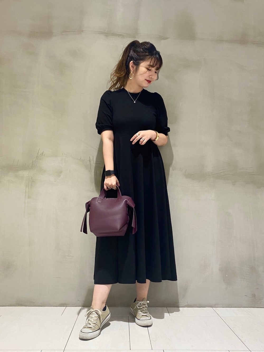 カットソーのワンピースなのに形が綺麗ですっきり見えします☺︎ ブラックワンピースにはゴールドアクセとベージュスニーカーで統一感を! パープルバックが晩夏のイメージを出してくれる!楽ちんなのに季節先取りコーデ♡