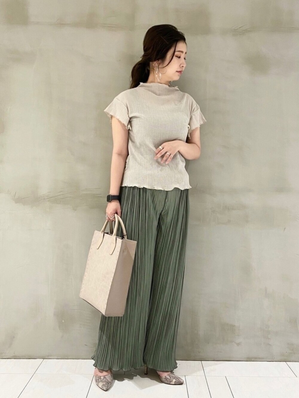 ちょっとそこまでにもお洒落に着こなせる、パンツ&カットソーコーデ☺︎ 大人気プリーツパンツを楊柳素材のてろっとした着心地抜群のトップスに合わせました! トップス→¥3900+税 ボトムス→¥6900+税 とプライスも魅力的♡ らくちんコーデには足下パンプスで女っぽさを☺︎