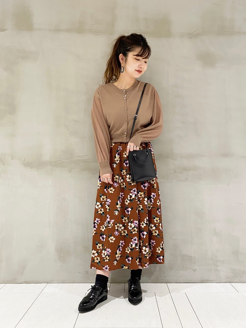 秋のデートコーデ☺︎ 花柄×ベージュのカーディガンで女の子らしさをプラス♡ 足元と鞄でカジュアルな抜け感を! ちなみに花柄のスカートは実はワンピースなんです! レイヤードコーデで着回し力抜群です!