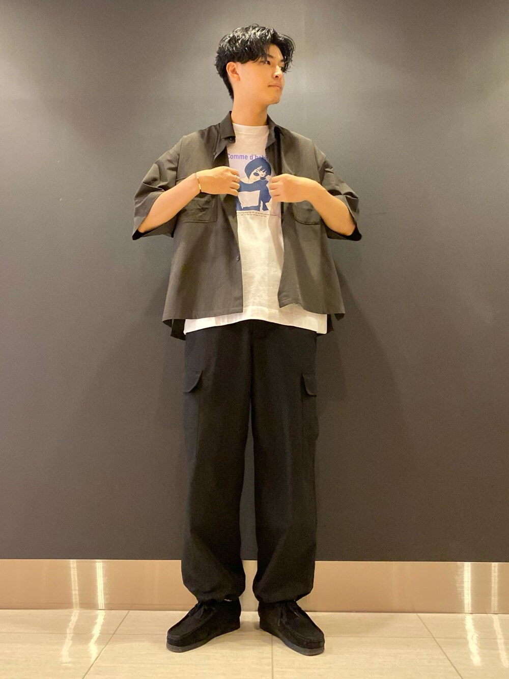 全体的に暗めのカラーでコーディネートしてみました! インナーにプリントTを入れて少しラフな印象に◎
