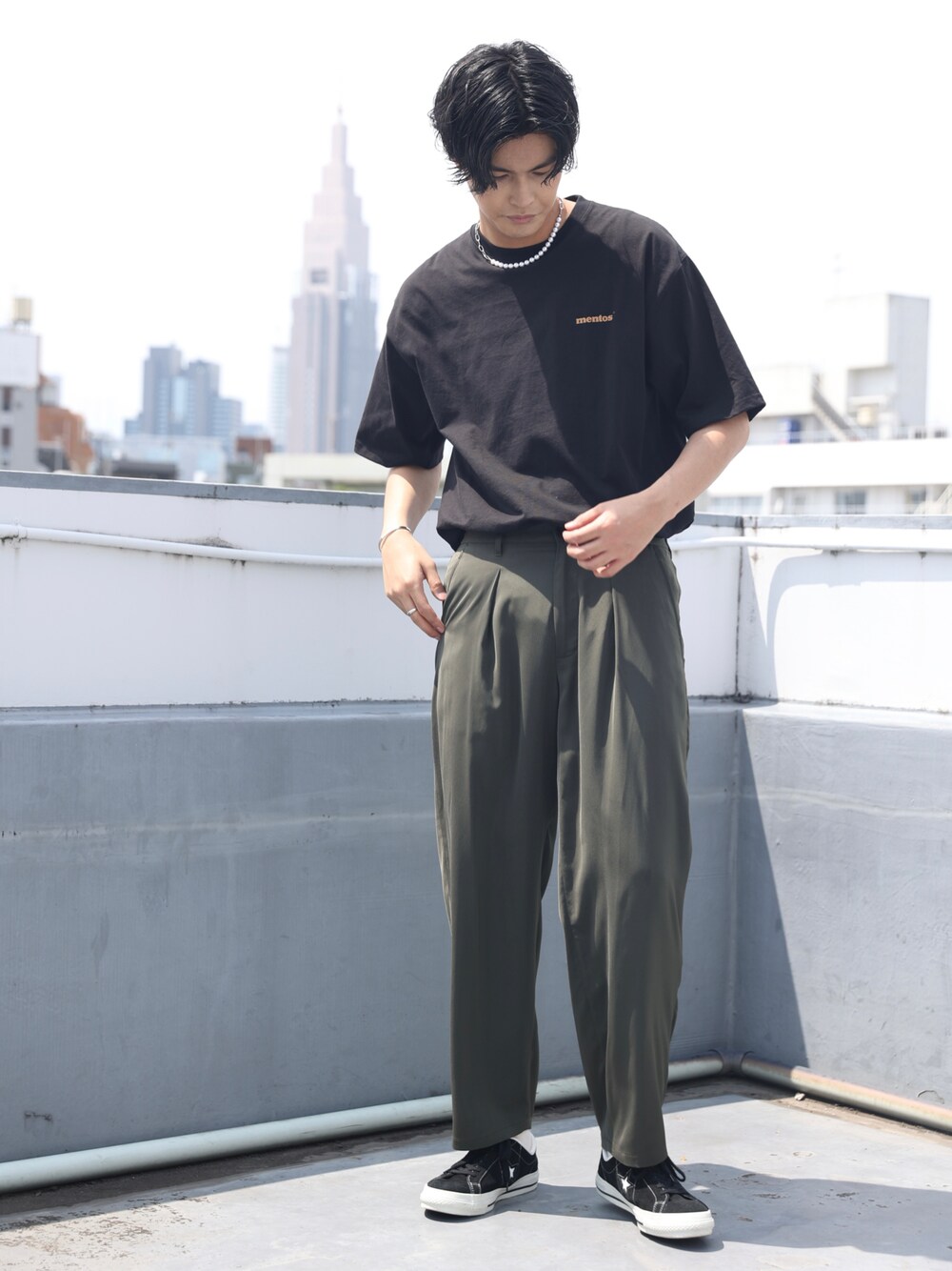 閲覧ありがとうございます! トレンドのグリーンのパンツを使ったコーディネートです🍃 黒のプリントTやシューズでまとめてみました! シャツを羽織らなくてもタックインやパールで程よいラフさに◎