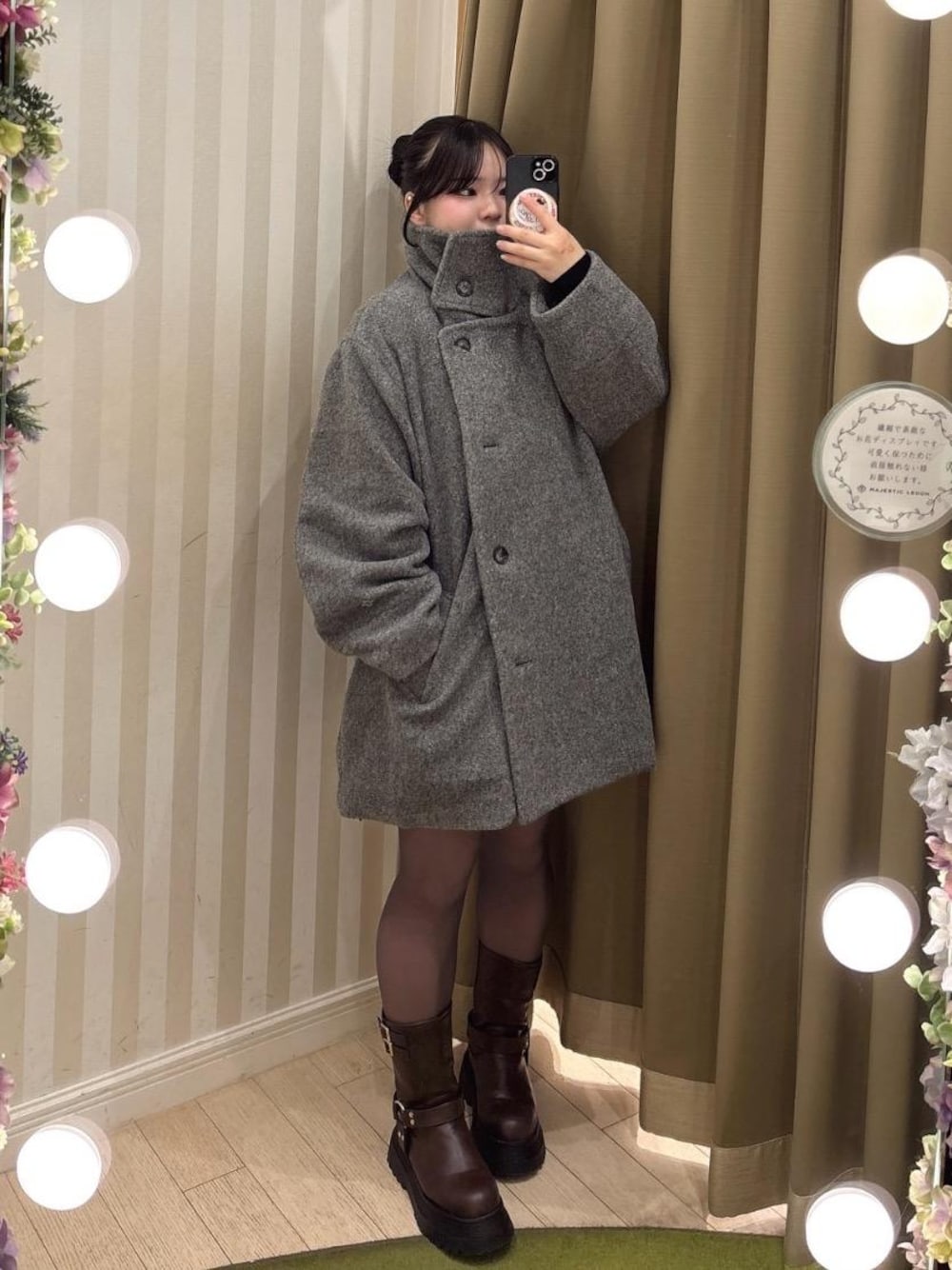 新作のアウター着てみました🫶🏻 全体的にオーバーサイズで、すっぽり着れてとってもかわいい! 生地がしっかりしてるので、ちゃんと暖かくて優秀です🥲 スタンドネックにしてお団子にするの可愛くておすすめです🩷