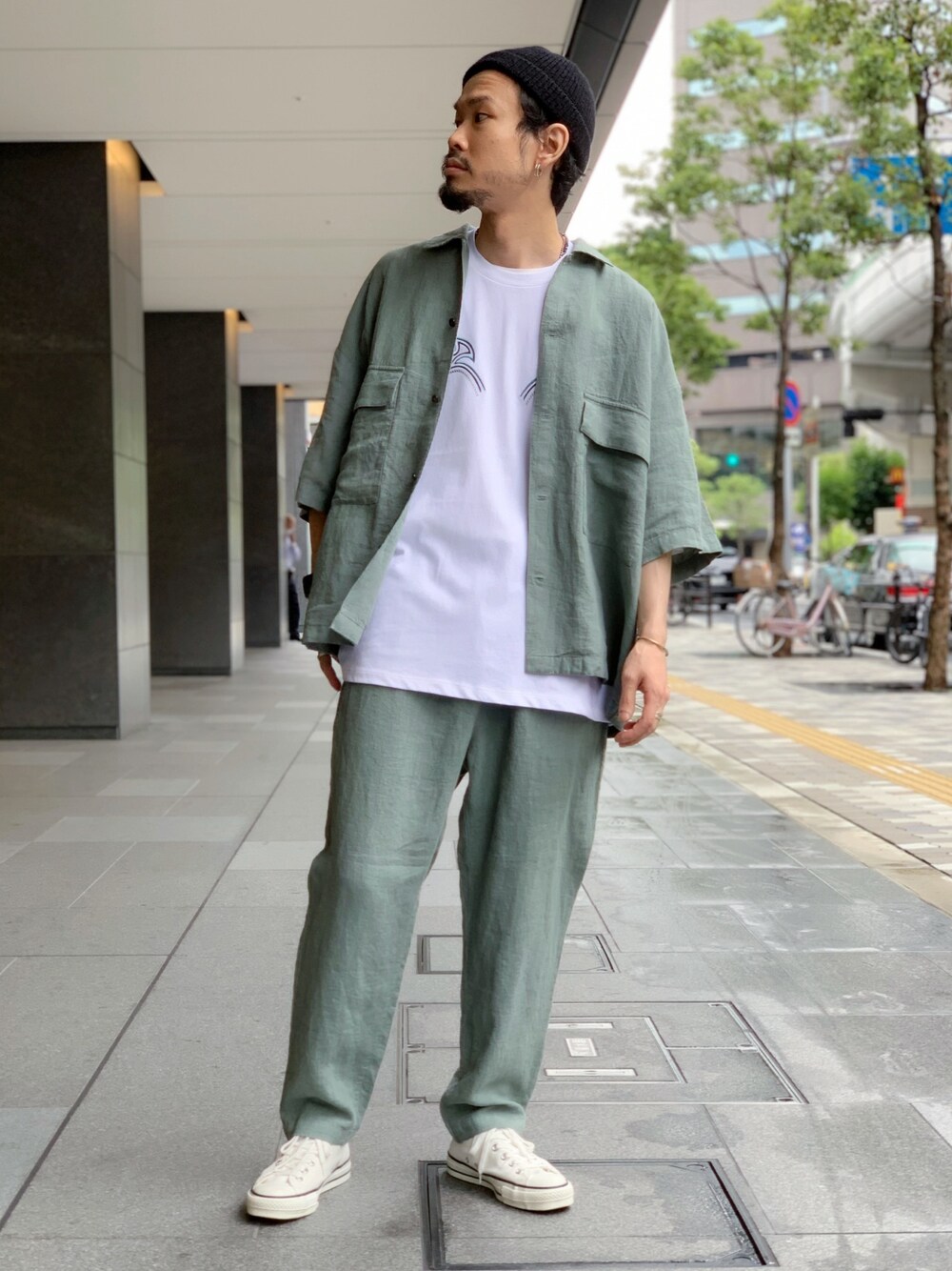 こんにちは!いつも閲覧ありがとうございます! 最近人気のセットアップスタイルにしてみました♪ 麻素材なので夏でも涼しく セットアップスタイルが楽しめます♪ インナーの胸元に柄をチラ見せさせて シンプルですがちょっとしたアクセントを加えてます! ぜひご覧になってみてください♪