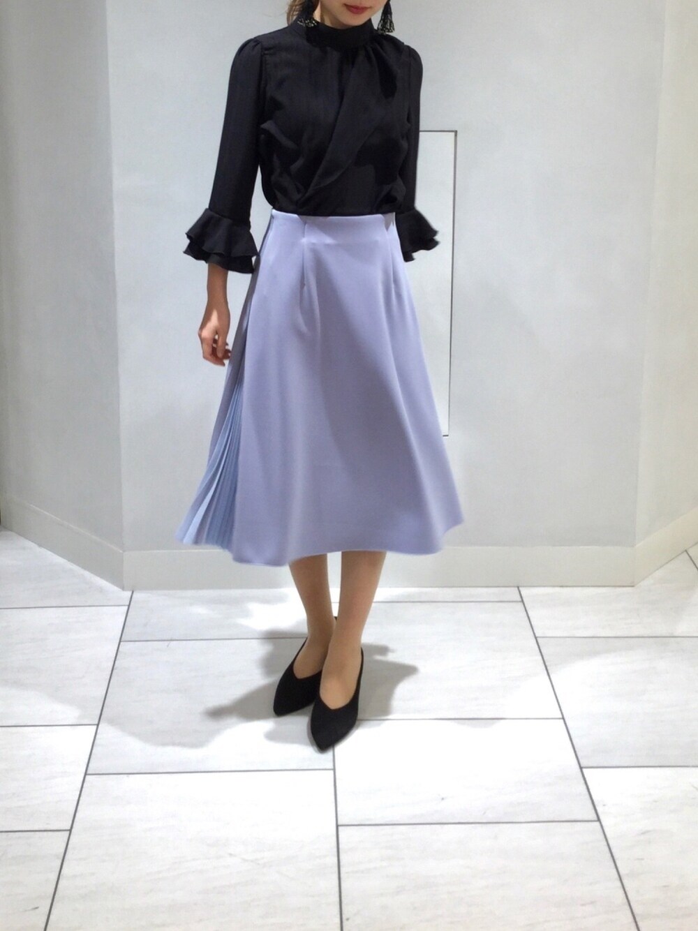 オケージョンから普段使いまで幅広く活躍するブラウスです。 甘すぎないフリル使いに一目惚れしました。 ブラウス 10-11-02-022 0size スカート 30-11-08-505 1size