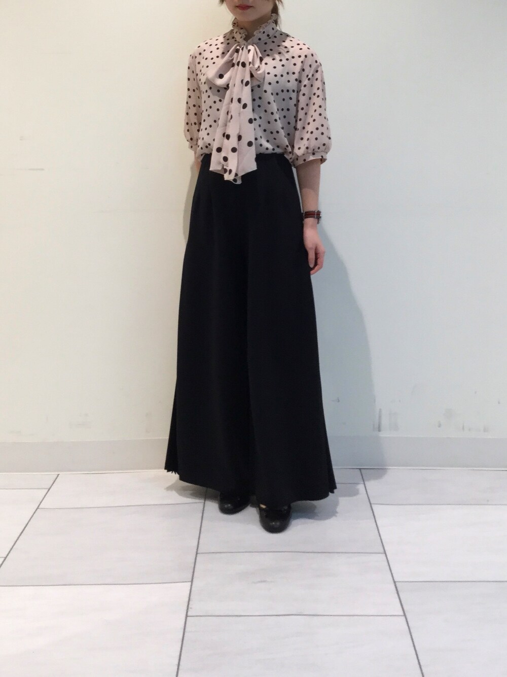大小のドットがかわいいブラウスです。 二の腕が隠れる袖の長さなので1枚でも着やすいです☺️🌸 ブラウス 10-11-04-013 0size パンツ 30-11-09-622 1size