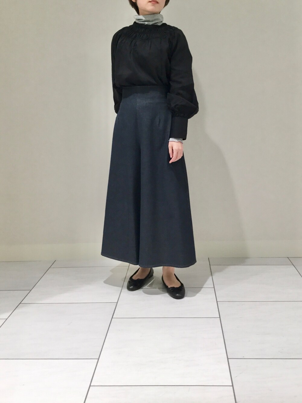 襟周りのギャザーがかわいい、着心地の良いブラウスにラメタートルをレイヤードしました。 デニム調パンツはハイウエストなので脚長効果があります! ブラウス 10-12-01-020 1サイズ カットソー 30-12-31-920 1サイズ パンツ 30-12-09-621 1サイズ