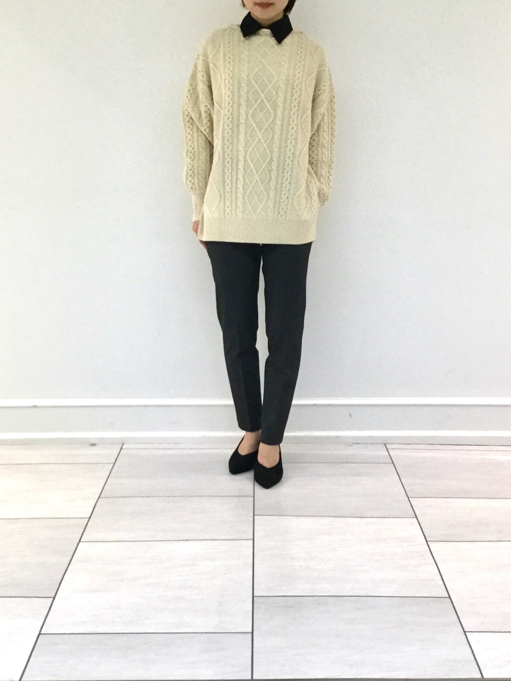 ニットはレイヤードしやすい襟ぐりでシャツカラーが綺麗に出ます。 シャツの代わりにスカーフやタートルネックを合わせてもグッドです。 家庭で手洗い出来ます。 シャツ 10-12-01-712 0サイズ 白 ニット 30-12-11-305 1サイズ ベージュ パンツ 30-12-09-706 0サイズ グレー