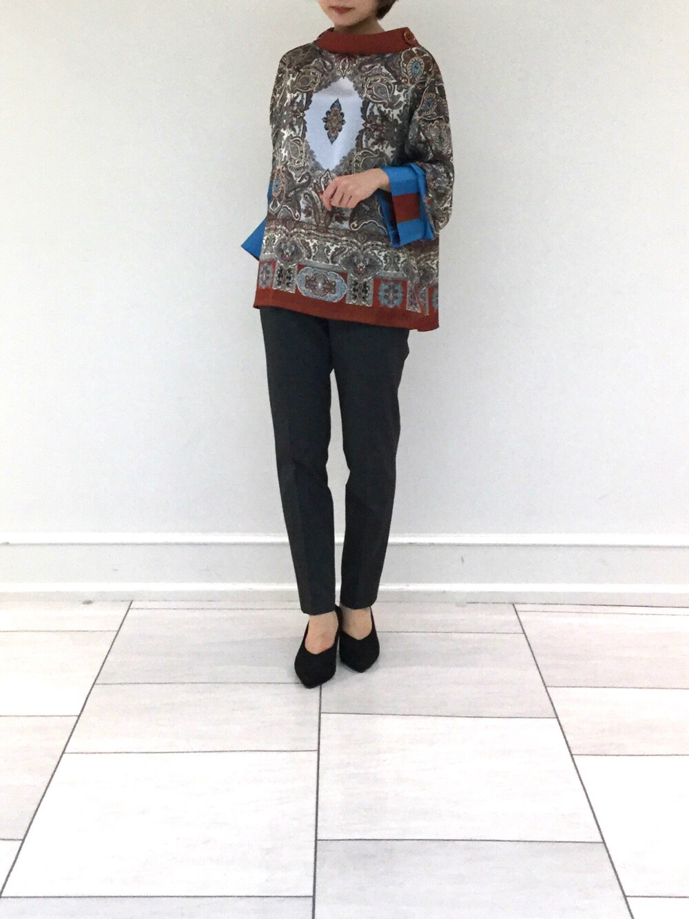 スカーフをそのまま身に纏ったようなペイズリー柄のイタリアンコレクション。 サテン生地で高級感があります。 ナラカミーチェならではの洗練された色使いとシルエットが素敵です。 ブラウス 10-12-01-232 1サイズ ブルー系 パンツ 30-12-09-706 0サイズ グレー