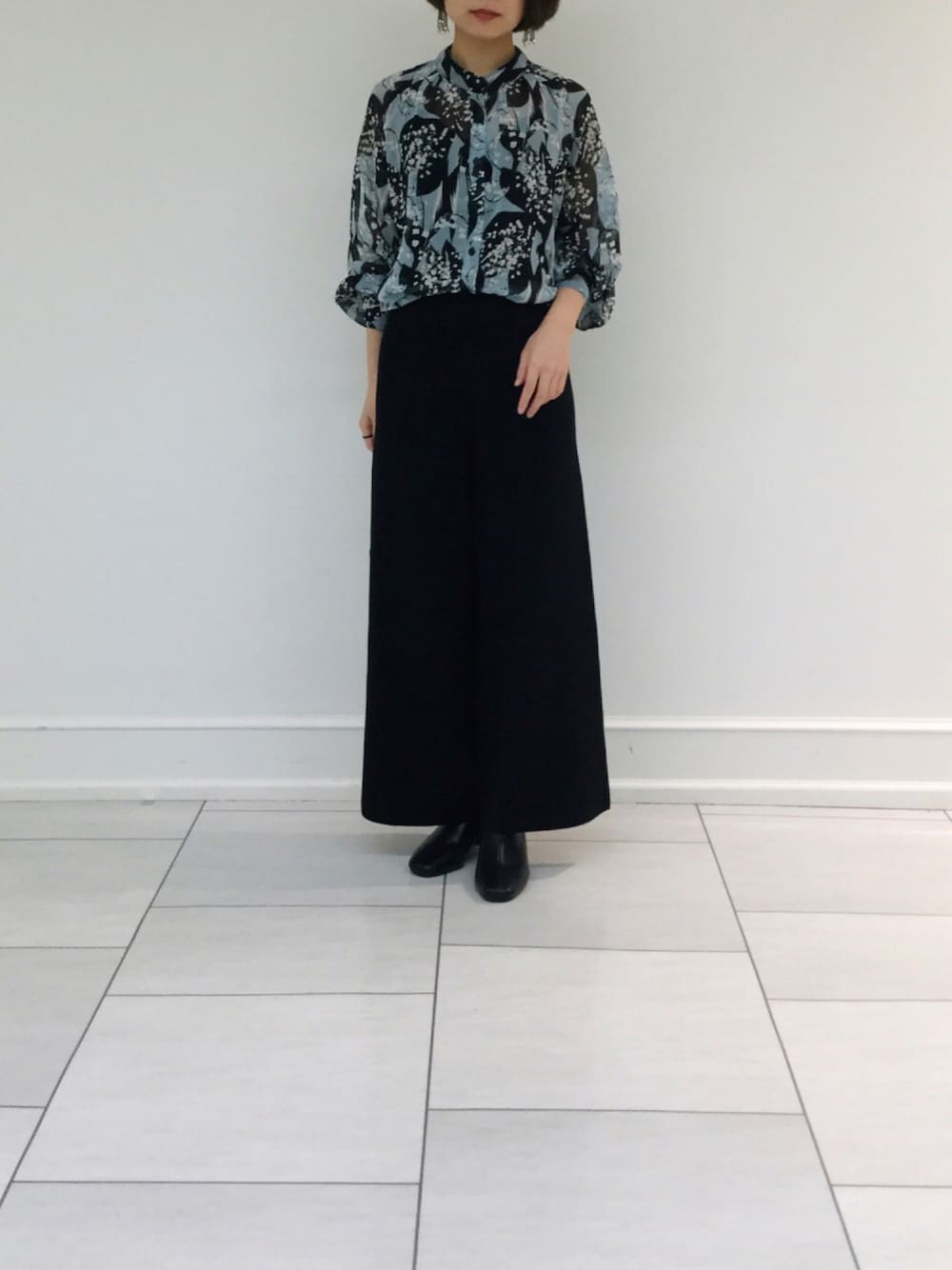 程よい透け感のすずらんの花柄ブラウス。 肩はラグランで着やすいです!袖は長袖を捲っています。 洗濯機で洗えます。 155㎝ 骨格ウェーブ ブラウス 10-21-01-525 1size blue パンツ 30-12-09-907 1size black