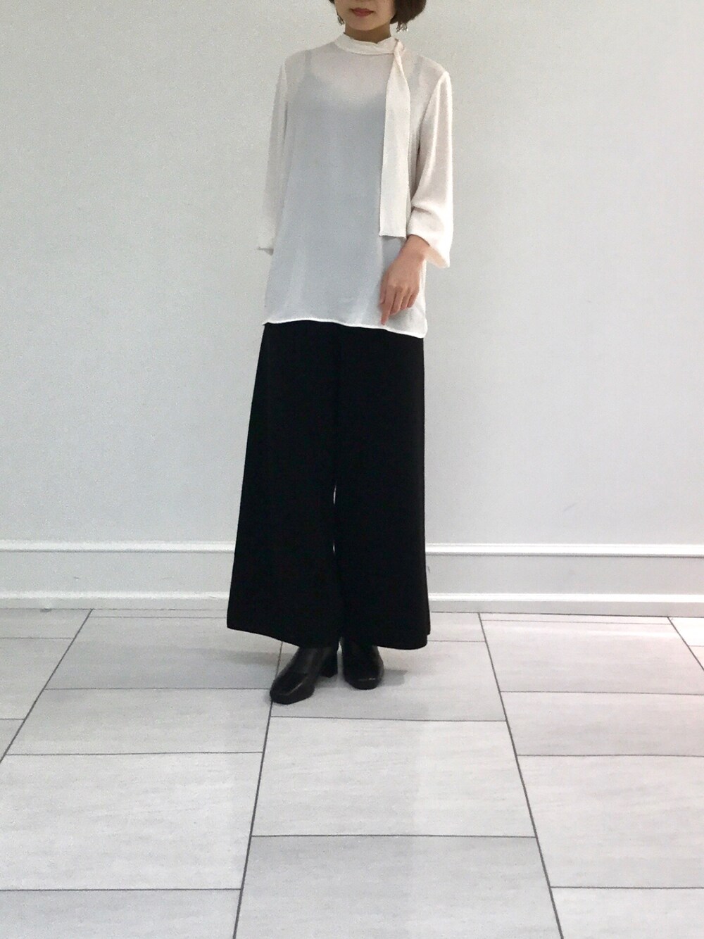 桜色の柔らかな色味のサイドボウタイブラウス。 首元にボタンが付いているので垂らすだけ、簡単です。 かなり透け感があるのでインナーをお召しください。 今回はボトムに合わせて黒を着ています。 155㎝ 骨格ウェーブ ブラウス 10-12-01-026 size pink パンツ 30-12-09-907 1size black