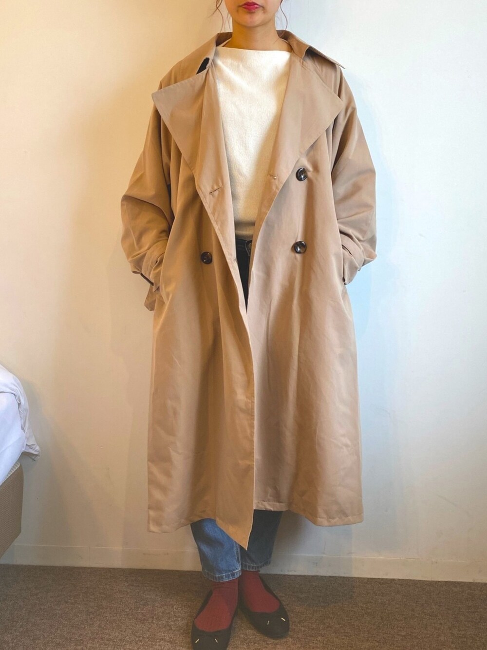 reiのトレンチコート「【2サイズ展開】キャンディ袖ビッグトレンチコート」を使ったコーディネート