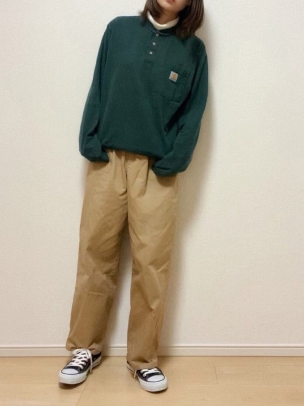 いつもありがとうございます🍊 なんか、秋、終わりました? 冬?もう冬なんですか? 状態ですね! カーハートのヘンリーネックロンTは古着屋で購入しました。 白のパンツを合わせてもかわです。