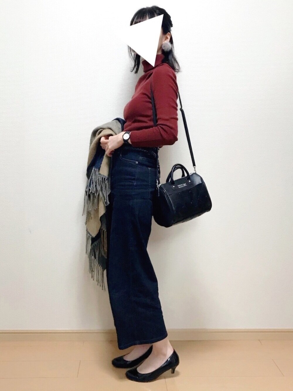 181114 出勤コーデ タイトなブラウンタートルニット×ワイドなワンウォデニムでAラインシルエット 明日はボーナス💰