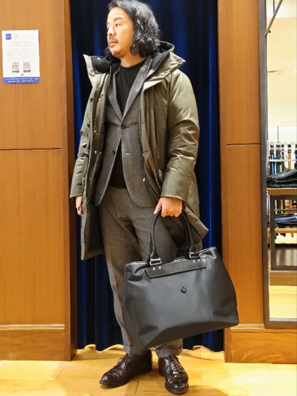 ツイードのセットアップにM47フィールドパーカーを合わせた、冬のビジカジスタイルです。ツイードジャケットのインナーはあえてカットソーにして力を抜いています。 【アウター】 M45フィールドパーカーを都会的にアレンジしたアウターです。 中綿には700FP以上の高品質ホワイトダックダウンを使用しており、非常に保温性に富んでいます。表面は撥水加工、透湿防風を使用しています。 通勤スタイルのアウターとしても使えるアイテムです。 【セットアップ】 全ての工程を日本国内で行っているリサイクル素材リニュールを使用し、温かみのある素材感と存在感があります。 ON/OFF兼用で使えるテーラードジャケットです。 カシミア混で見た目以上に滑らかな肌触りです。 【カットソー】 ジャケットのインナーに最適な上品Tシャツ。 クルーネックよりやや高いハーフモックネックはジャケットの襟裏に皮脂汚れが付きにくい絶妙なネックバランスなっています。 ON/OFF兼用で使えるビジカジでの有能アイテムです。 【バッグ】 CLEDRAN ノーリーズ別注 肩掛けできる長めのハンドルは荷物が多い日も快適な使い心地で、両サイドのマチ部分にあるホックを外せば横幅が大きく広がり容量アップ。また、口元部分のホックを外せば開口部が大きく広がり、大きな物の出し入れもスムーズです。ブラックレザーが部分的に使われており、クールなルックスでON/OFF(ビジネスカジュアル)問わず使えるユースフルなトートバッグです。 ノーリーズ別注として、ミラコスモ(R)という不純物の少ない発色性の優れた糸を使っているため、鮮やかな色と光沢感が特徴のナイロンサテン地をメイン素材として使用し、付属レザーにはタンニン鞣しの上質な国産の本革を使用。裏地はシックなネイビー色の国産綿ツイル生地を使用しています。 着用サイズ 【アウター】 Mサイズ 【ジャケット】Sサイズ 【パンツ】 Mサイズ 【カットソー】Mサイズ