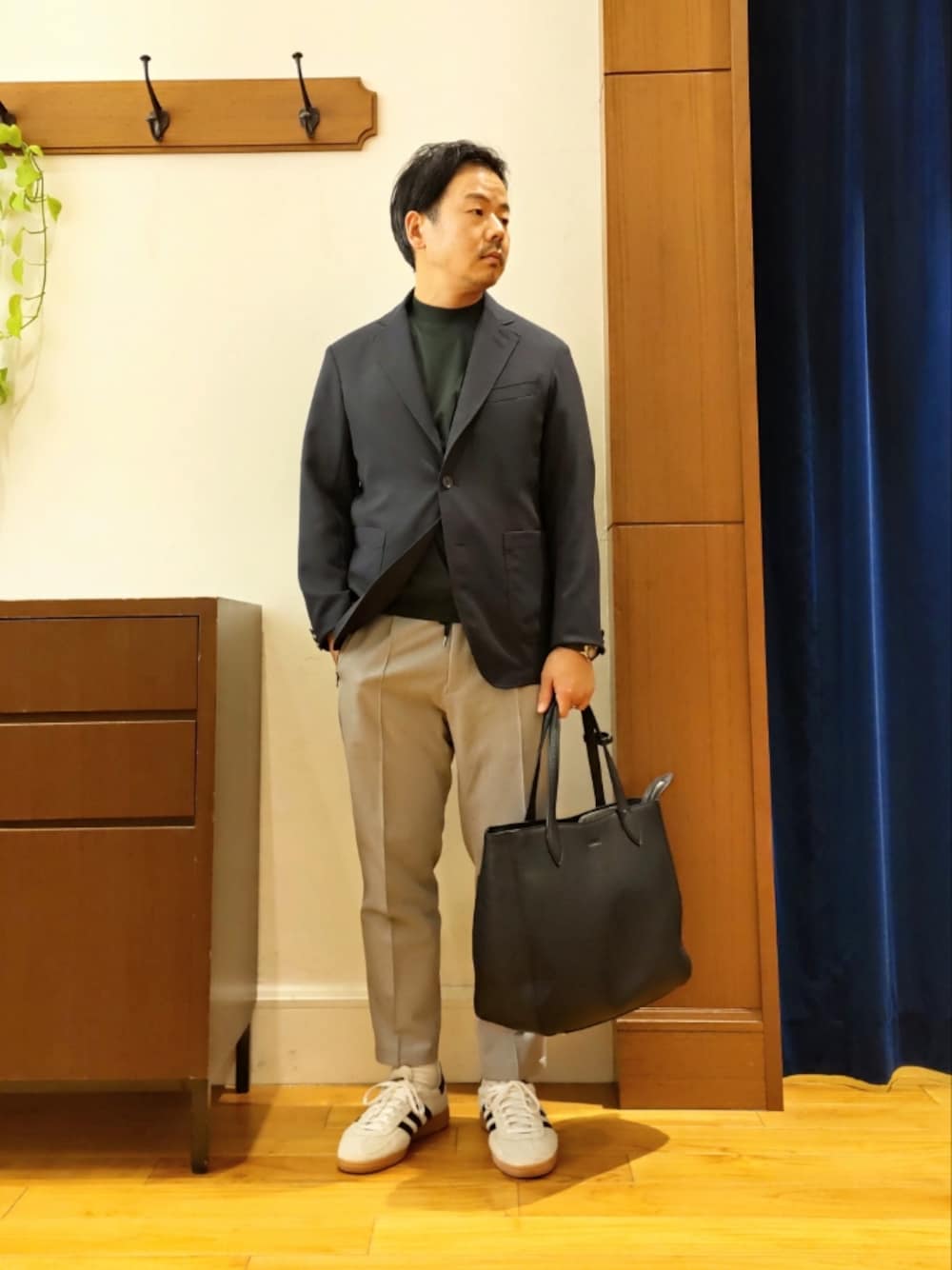 春から夏に向けたジャケットスタイルです。ワンタックパンツにスニーカーを合わせて、軽やかでスポーティーな印象のビジネスカジュアルスタイルです。 【ジャケット】 吸汗・速乾素材の『EVALET』を使用したテーラードジャケット。ポリエステル素材で麻の様な清涼感を実現した素材です。シワになりにくく、さらにストレッチ性も持たせた機能性の高いアイテムです。 【カットソー】 ジャケットのインナーに最適な上品Tシャツ。 クルーネックよりやや高いハーフモックネックはジャケットの襟裏に皮脂汚れが付きにくい絶妙なネックバランスなっています。 ON/OFF兼用で使えるビジカジでの有能アイテムです。 【パンツ】 センタークリースラインにつまみコバを入れ、足脚のラインきれいにみせるワンタックパンツです。 ツイルサキソニーの適度な光沢とウールの様な見え方でジャケットスタイルにもピッタリのアイテムです。 キレイめ×スポーティーのハイブリッドなパンツです。 【バッグ】 シュテットシュタインが提案するイタリアンレザーを使用したビジネストートバッグ。 ヴェネタ・イタリアーナ・ペッレ社のイタリアンレザーを贅沢に使用。革の風合いを活かすべく仕立てたデザインは、曲線と直線が程よくミックスされたユニセックスで飽きのこないシンプルなデザイン。ハンドルは肩に掛けてお使いいただける長さと、気の利いたポケットが多数配置されており、それぞれが適度なサイズ感でビジネスシーンにおいてサポートしてくれます。裏地はポリスエード生地を使用し、高級感のある柔らかな印象に仕上げています。 着用サイズ 【ジャケット】 Mサイズ 【カットソー】 Mサイズ 【パンツ】 Mサイズ 《セットアップ対応》EVALET リネンライク メッシュジャケット/¥26,950 《ビジカジ対応》シルケットスムース / 天竺 ジャケット用Tシャツ/¥7,590 WILLAMSBURG ビジネスレザートートバッグ/¥44,000 TRサキソニー イージータックパンツ/¥9,570 #オフィススタイル #大人カジュアル #おでかけ #NOLLEY'S #きれいめ #低身長
