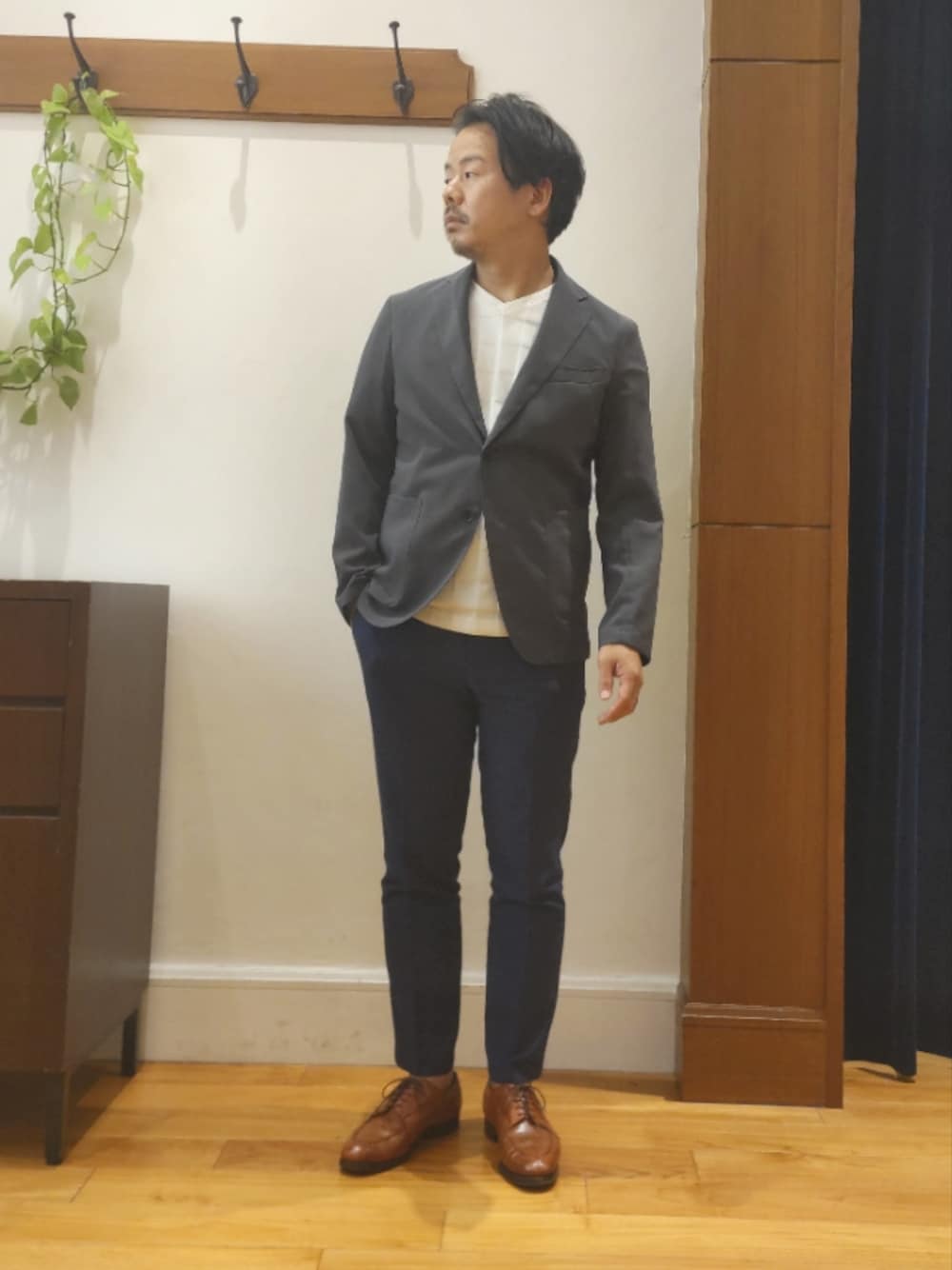 夏の暑い日でも快適に着ていただけるDotAir素材を使用したジャケットを使ったコーディネートです。インにvネックのカットソーを合わせて、すっきりとしたコーディネートにしました。 【ジャケット】 高通気快適素材DotAir(R)を使用したジャケットです。 空気孔のある生地は通気性に優れ、暑い日でも快適に着ていただけます。ポリエステル100%でシワになりにく、ご自宅でのお洗濯も可能になっています。 ウエストの絞りを抑えた、ややボクシーなシルエットになってるので、リラックスして着ていただけます。 普段はMサイズですが、リラックスシルエットなのでSサイズを着用しています。 【カットソー】 シルケット加工が施され表面を滑らかにしており、上品な光沢感あります。 着心地を考えて作られた立体的なパターンで、スッキリとしたシルエットながら着心地は、抜群に良いです。浅めのVネックで首元が開き過ぎないのでビジネスシーンでも使いやすいです。袖口も細身のシルエットなのでジャケットの中にも合わせやすいです。 【パンツ】 テーパードの効いた、スリムシルエットのパンツです。機能素材SOLOTEX/ソロテックス(R)を使用しており、柔らかな風合いと高いストレッチ性、形状回復性を併せ持ったパンツです。 適度な光沢感が上品な印象でビジネスパンツとして、ジャケットとの相性も良いです。 着用サイズ 【ジャケット】 Sサイズ 【カットソー】 Mサイズ 【パンツ】 Mサイズ