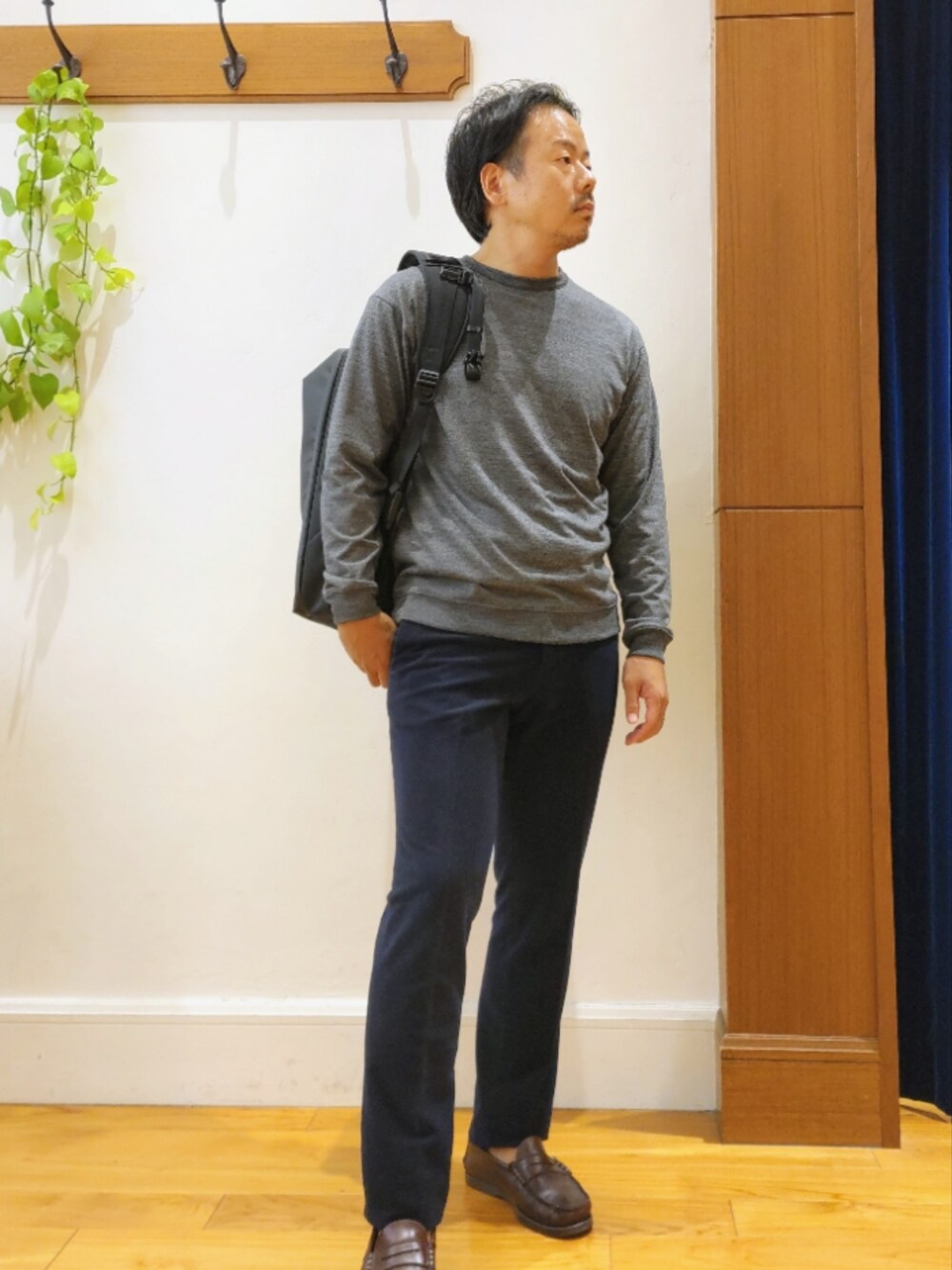 上品なウール素材を使用したカットソーをメインにした、ビジカジスタイルです。上品な風合いのウールカットソーなので、一枚着でも綺麗に見えます。上品な印象になるので、ビジネスカジュアルでも使って頂けます。ジャケットのインナーとしても最適です。 【カットソー】 このところ注目されているウール素材のロンT。国内最古の ウールメーカー日本毛織(NIKKE)が開発した、クールマックスを 30%加えた吸水速乾性に優れたウール天竺は、年間通して使える 大人のインナーです。 【パンツ】 ストレッチ性に富んだコーデュロイパンツです。 細身のシルエットですが、ストレッチ性が強く非常に履き心地の良いパンツです。 ポリエステル性のコーデュロイなので、光沢感もあり上品な印象のコーデュロイパンツです。 【バッグ】 ベルーフのバックパックです。 2ルーム仕様になっており、ビジネスシーンでの使用したことを想定して、PC用のポケットやペンや周辺機器を入れる細かなポケットも沢山ついています。 撥水性に優れた素材ですので、雨の日でも安心して使って頂けます。 着用サイズ 【カットソー】Mサイズ 【パンツ】 Mサイズ