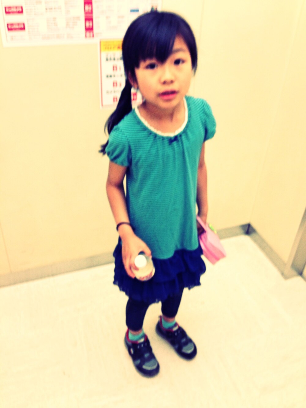 グリーン系のTシャツ/カットソー、ブルー系のその他パンツを着用したキッズの春コーディネートの1枚目の写真