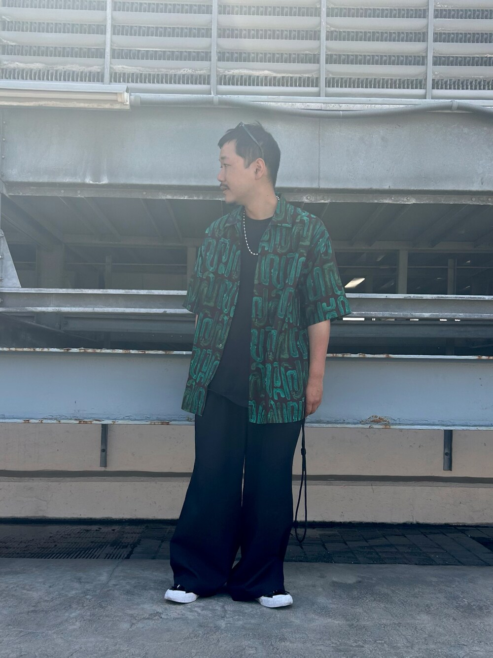 レトロ感ある柄が引き立つようブラックと合わせスタイリング。 1枚で様になりオープンカラーにもなる2WAY仕様です!