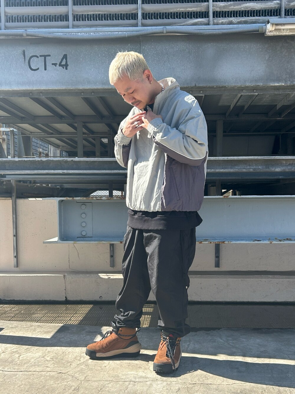 ナイロンアノラックと同素材のナイロンジョガーパンツを合わせたセットアップスタイル。 サイズ感はオーバーサイズで動きやすく、裾にドローコードがあり丈も調節でき今年らしいアイテム。 マンネリしたスタイリングを解消したい方にオススメスタイリングです!