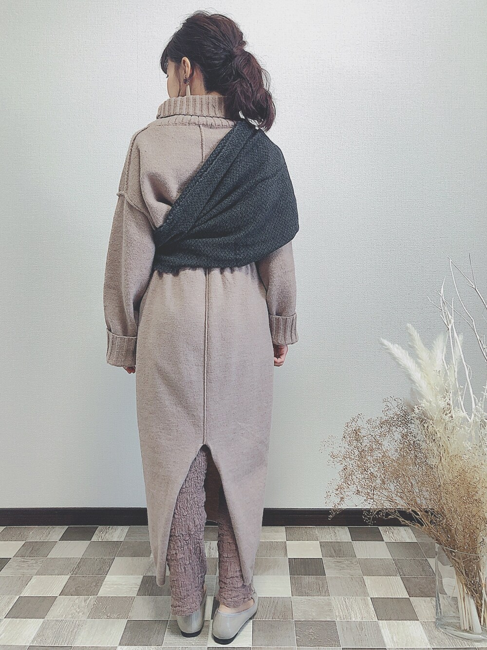 ニットのトップスとスカートのセット 低身長なのでニットインしてストールでたすきがけでボリュームを抑えました。 スカートの後ろ開きが深めなのでレギンスと♡