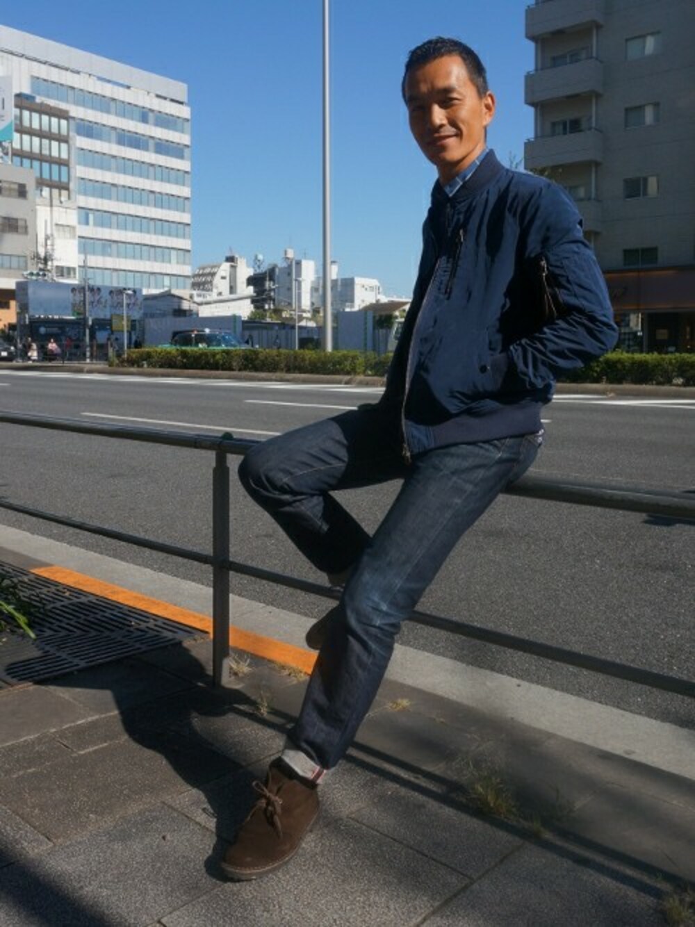 メモリー系素材のMA-1を、きれいめなウインドペンチェックのシャツに合わせ、大人カジュアルスタイルでコーディネート。拘りのデニムはメイドインジャパン。ナローシルエットですっきりまとめました。