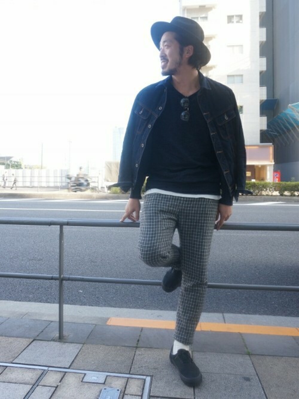 Gジャンにウールツイードパンツを合わせ、きれいめミックススタイルを提案。 今年注目のロングブリムハットがスタイリングのポイントに。