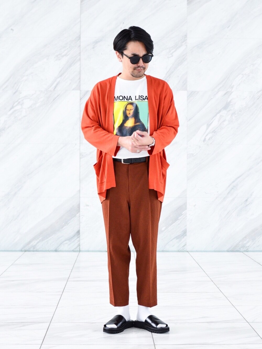 赤系のカラーを使い個性を出したコーディネートです。インナーのモナリザTシャツでワンポイント効かせて遊びを加えてます。