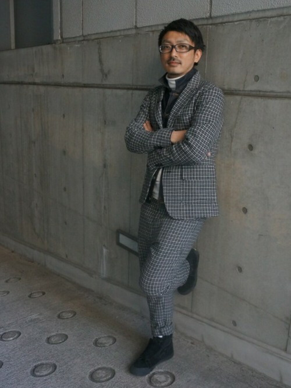 ツイードのセットアップスタイル。インナーにGジャンを合わせることで今年らしいスタイリングに。セットアップとタートルネックは今期注目のアイテムです。