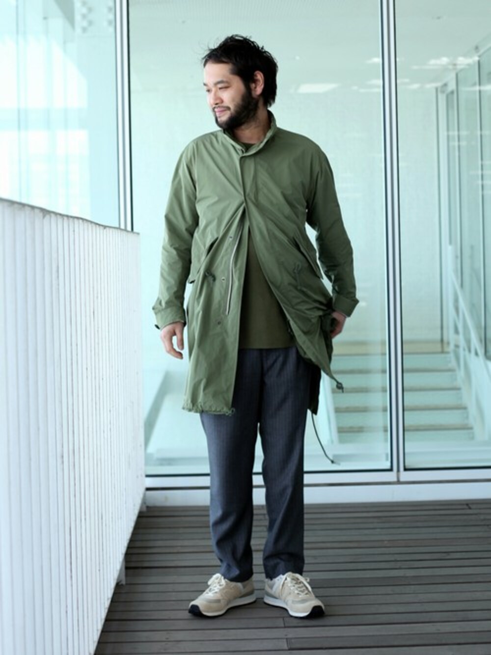 スタンドモッズコートを程よく無骨な印象を残しつつ、イージースラックスやスニーカーといったアイテムを合わせて軽快な雰囲気にまとめています。アイテムの素材感と配色のいずれも、ライトな着こなしで見せるのが今の気分です。