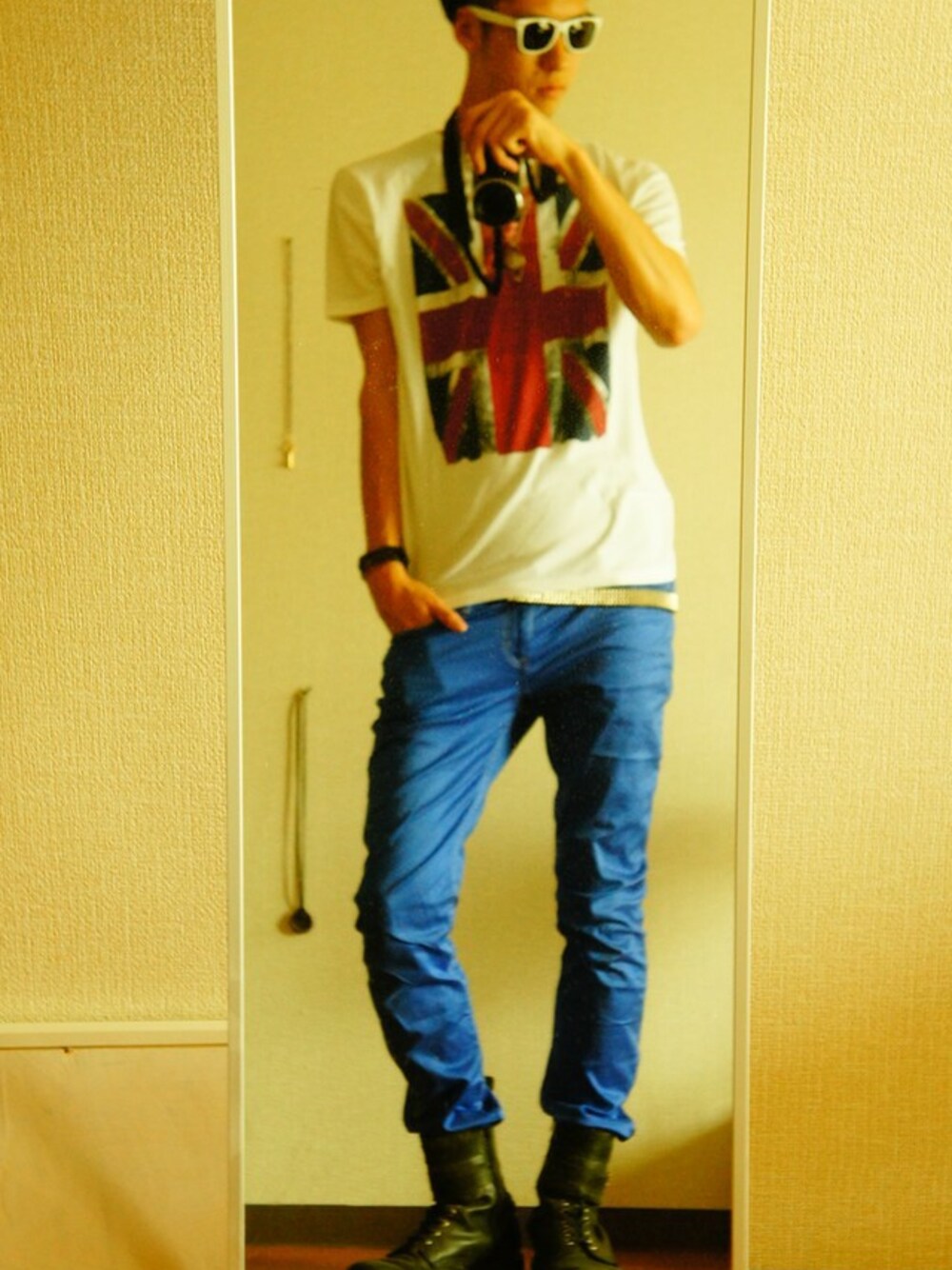 TOPMANで購入した ユニオンジャックTシャツと 白フレームのサングラス! 気持ちはロンドンだ! 気持ちロックテイストを取り入れて スタッズベルトとかつけてみたりしたコーデです。
